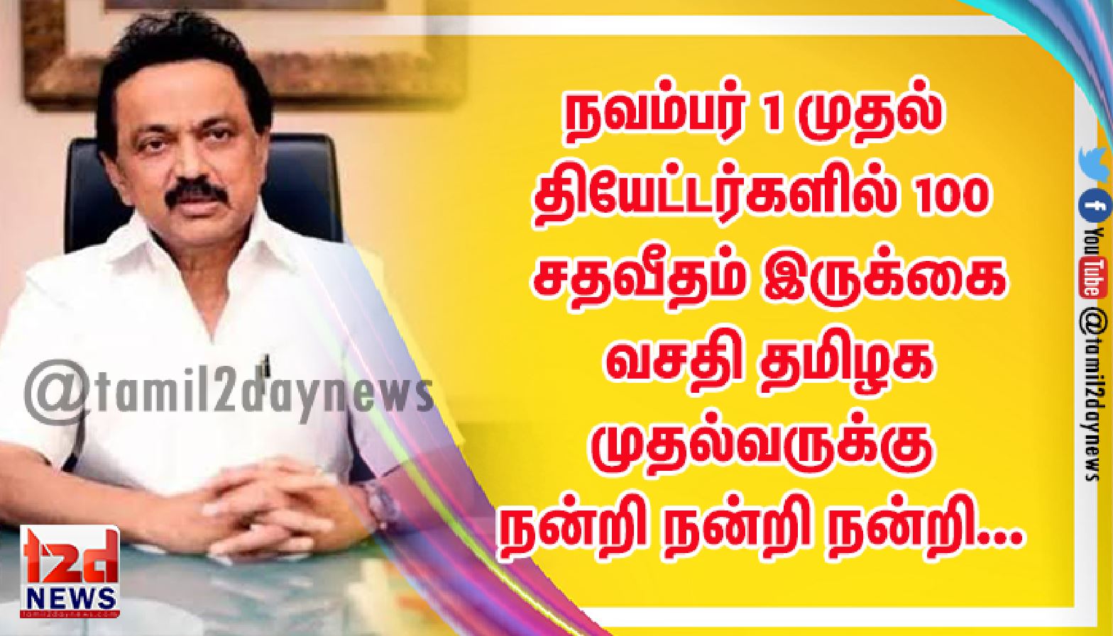 தமிழ் திரைப்பட தயாரிப்பாளர்கள் சங்கம் சார்பில் தலைவர் என். இராமசாமி வெளியிட்டுள்ள அறிக்கையில், ” தமிழ் திரைப்பட தயாரிப்பாளர்கள் சங்கம் சார்பில் தமிழக முதல்வர் அவர்களுக்கு திரையரங்குகளில் நூறு சதவிகித இருக்கைகளில் மக்கள் அமர்ந்து படம் பார்த்து கண்டு களிக்க ஆணை பிறப்பிக்குமாறு வேண்டுகோள் விடுத்திருந்தோம். அந்த வேண்டுகோளை ஏற்று இன்று தமிழக முதல்வர் அவர்கள் திரையரங்குகளில் நூறு சதவிகித இருக்கைகளில் அமர்ந்து படம் பார்க்க ஆணை பிறப்பித்துள்ளார். முதல்வர் அவர்களுக்கும், தமிழக அரசிற்கும் தமிழ் திரைப்பட தயாரிப்பாளர்கள் சங்கம் சார்பில் இருகரம் குவித்து நன்றியினை தெரிவித்துக்கொள்கிறோம். இவ்வாறு அந்த அறிக்கையில் தெரிவித்துள்ளார்.