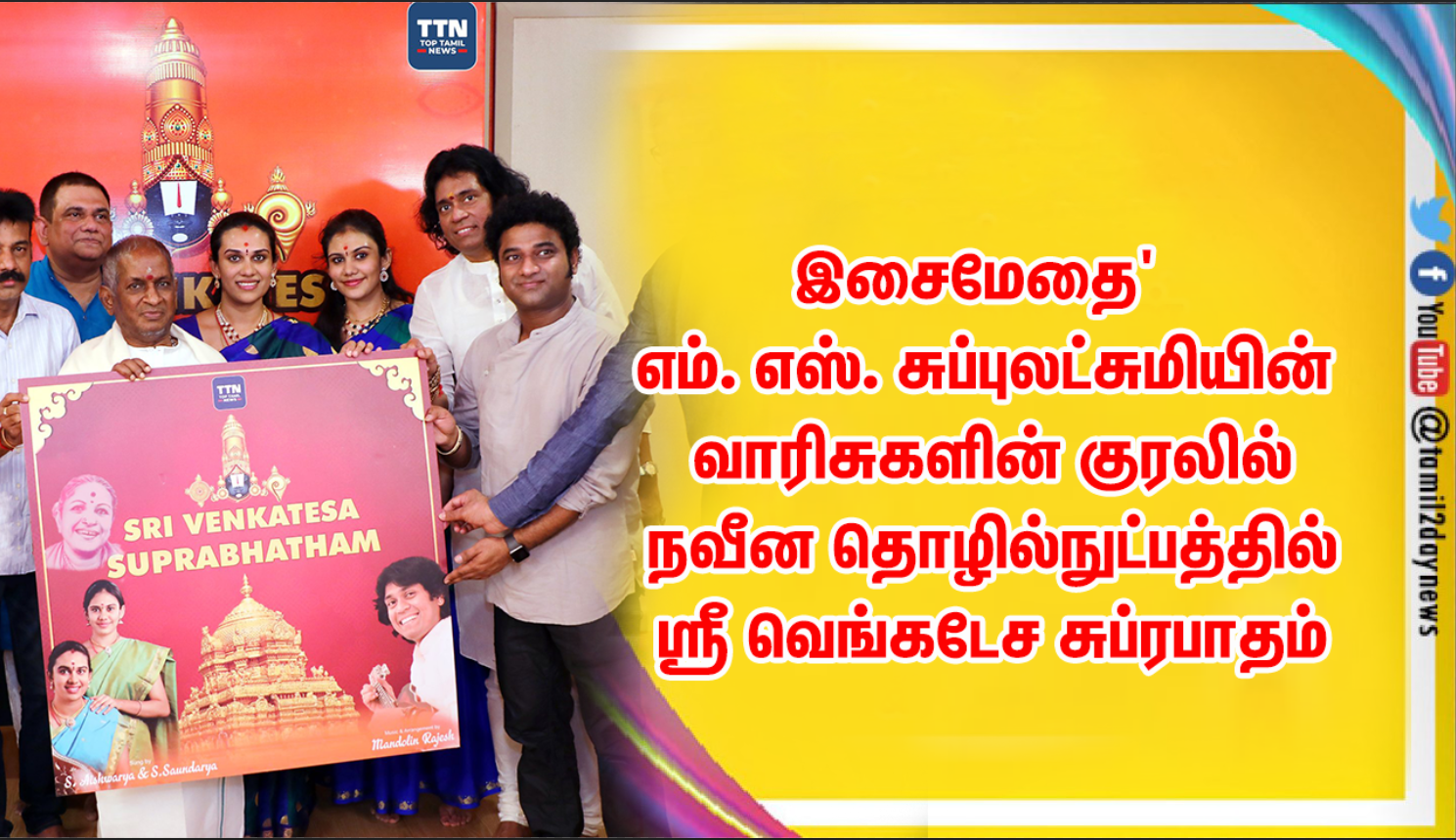 ஏற்கனவே கந்த சஷ்டி கவசத்தை சூப்பர் சிங்கர் புகழ் பிரியங்கா குரலில் வெளியிட்டு 12 மில்லியன் பார்வையாளர்களை கடந்து சாதனை படைத்த டாப் தமிழ் நியூஸ் நிர்வாகம், தற்போது ஸ்ரீ வெங்கடேச சுப்ரபாதத்தை எம்.எஸ். சுப்புலட்சுமி அவர்களின் கொள்ளு பேத்திகள் எஸ்.ஐஸ்வர்யா மற்றும் எஸ். சௌந்தர்யா ஆகியோர் பாட, மாண்டலின் கலைஞர் ராஜேஷ் இசையில் புதுப்பொலிவுடன் வெளியிட்டுள்ளது.