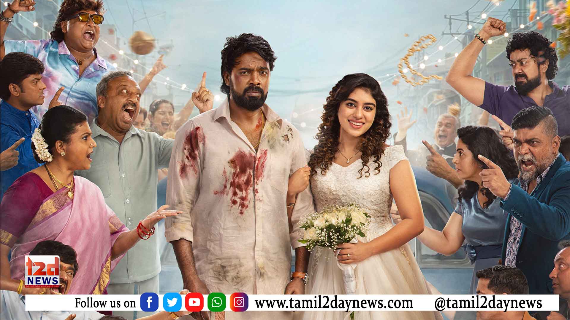 படத்தின் ஃபர்ஸ்ட் லுக், முதல் பார்வையிலேயே கவனத்தை ஈர்க்கும் வகையில் வடிவமைக்கப்பட்டுள்ளது. நடுவில், ரத்தக் கறைகள் படிந்த உடையுடன் மணமகன் கோலத்தில் நிற்கும் பாரி இளவழகன், அதற்கு நேரெதிராக வெள்ளை உடையில் கையில் மலர்க்கொத்து ஏந்தி புன்னகையுடன் மணகமகள்  கோலத்தில் நிற்கும் ரம்யா ரங்கநாதன்,  என இருவரும் கல்யாண கோலத்தில் இருக்க, அவர்களைச்  சுற்றியுள்ள கதாபாத்திரங்கள் காட்டும் பலவிதமான முக பாவனைகள், பறக்கும் பல பொருட்கள் என எல்லாம் இணைந்து, இப்படம் அனைத்து தரப்பு ரசிகர்களையும் கவரும் ஜாலியான ஃபேமிலி என்டர்டெயினர் என்பதை உறுதி செய்கின்றன.